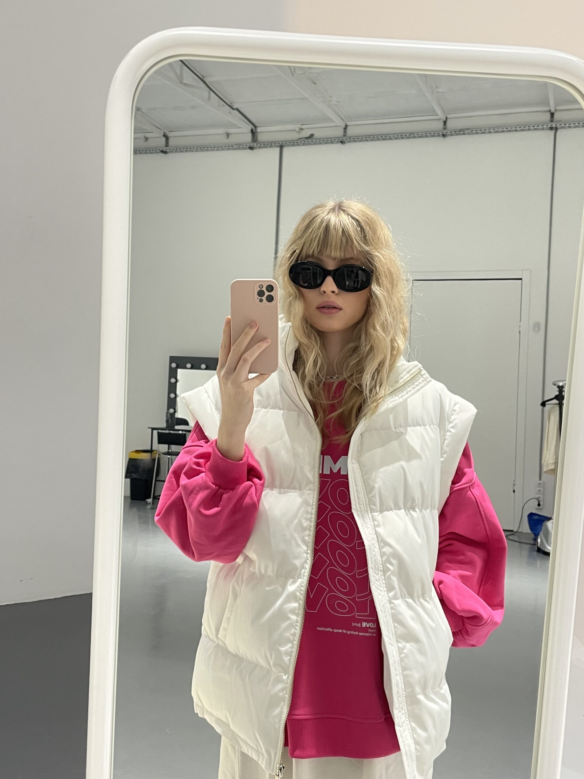 Базовый жилет на молнии с кнопками. Свободная модель, боковые карманы, пояс. На модели размер XS/S при росте 170см.