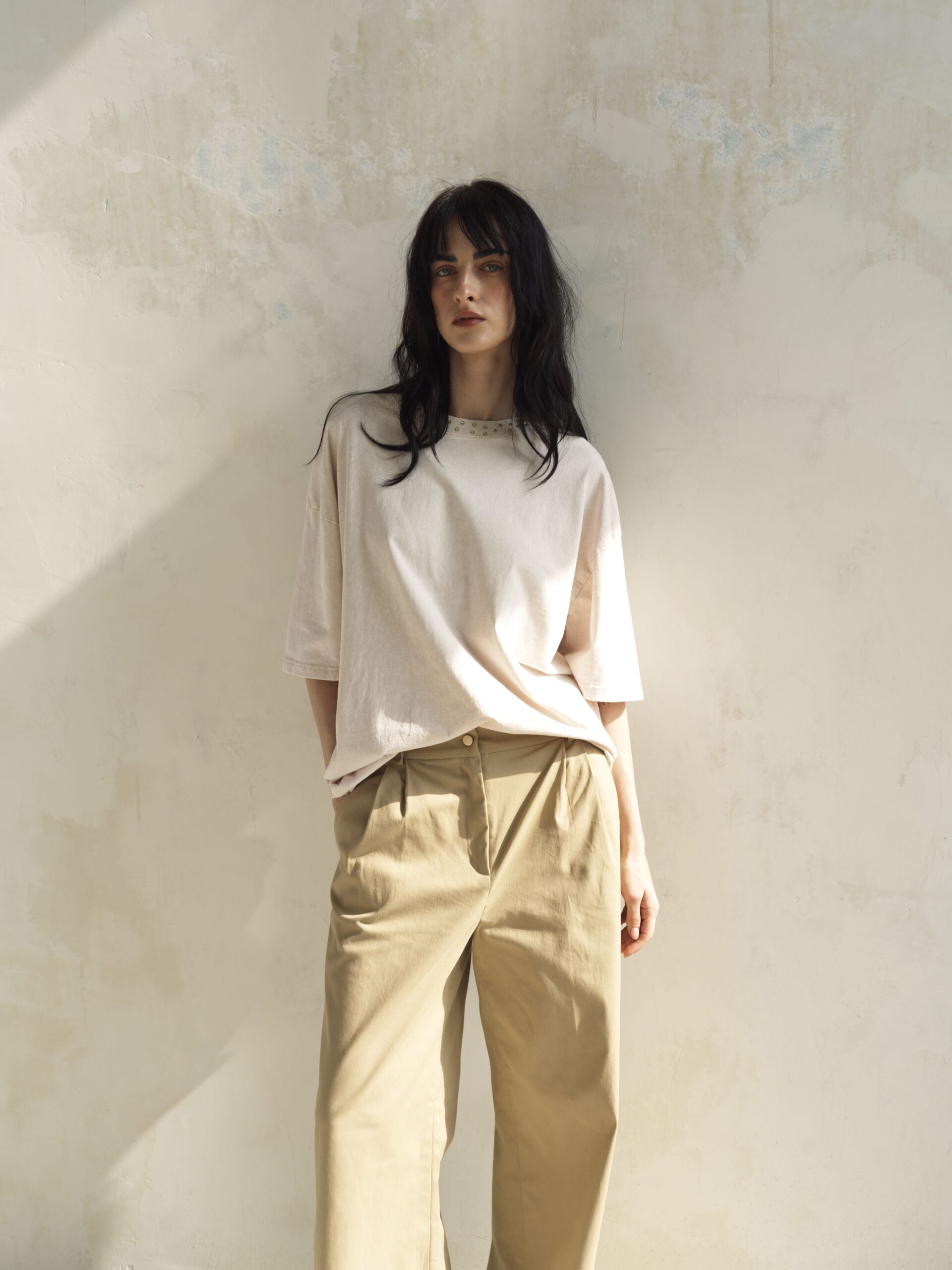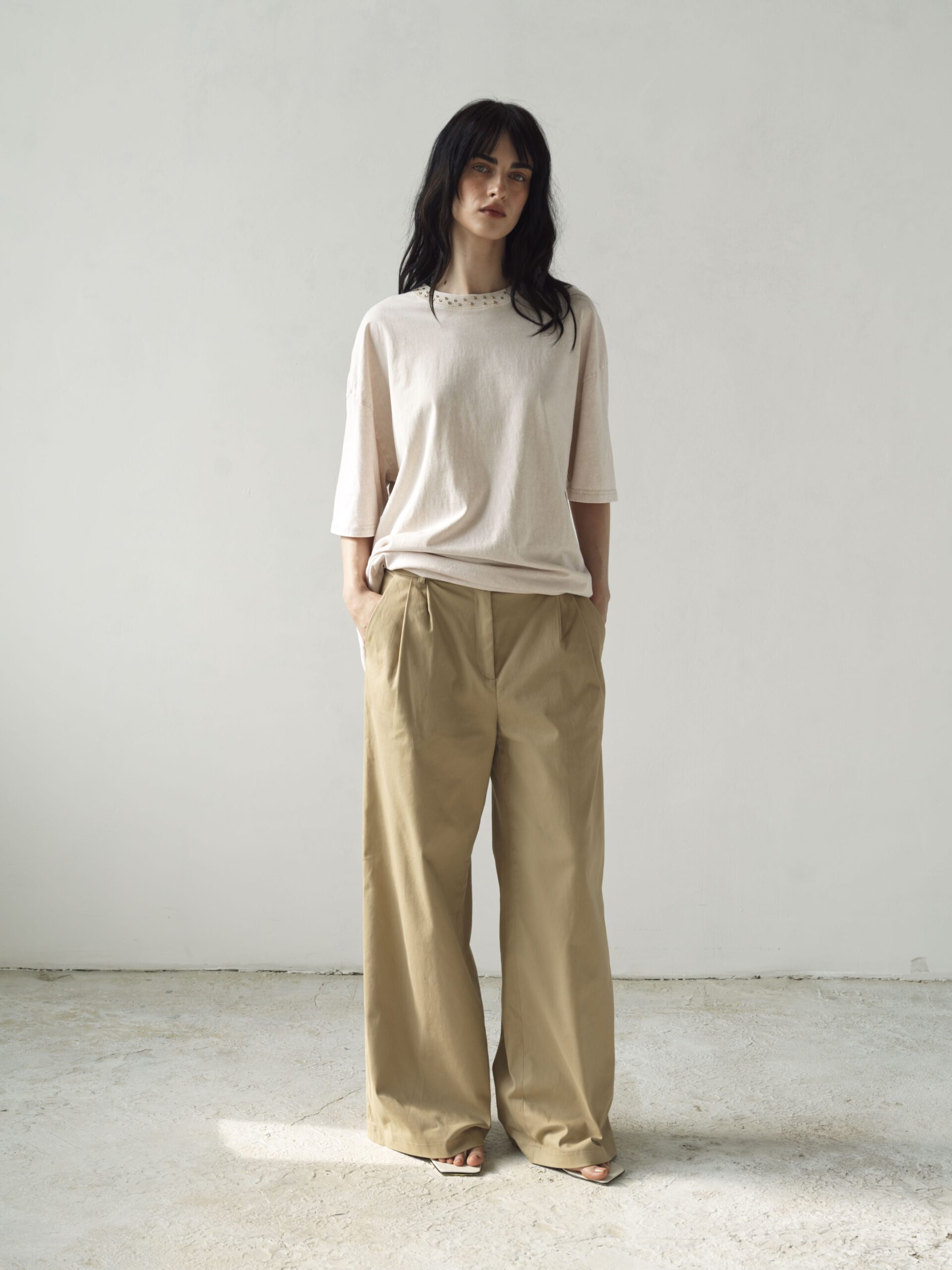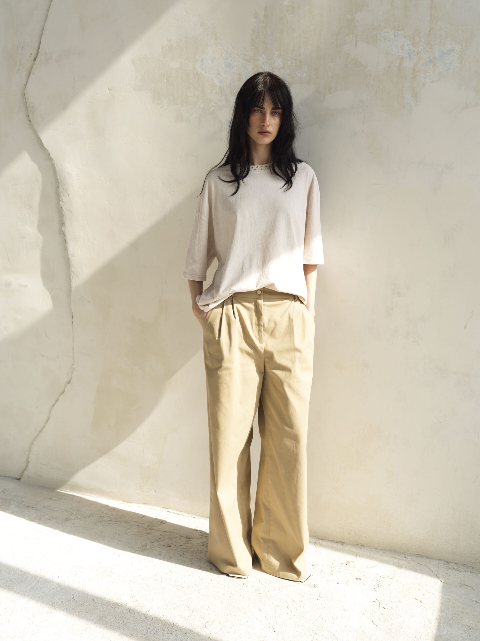 Елегантні та бездоганно скроєні джинси палаццо, виконані з натуральної бавовни — ідеальне поєднання комфорту та витонченості. Тканина м’яка, приємна до тіла, красиво тримає форму й створює розкішний силует.