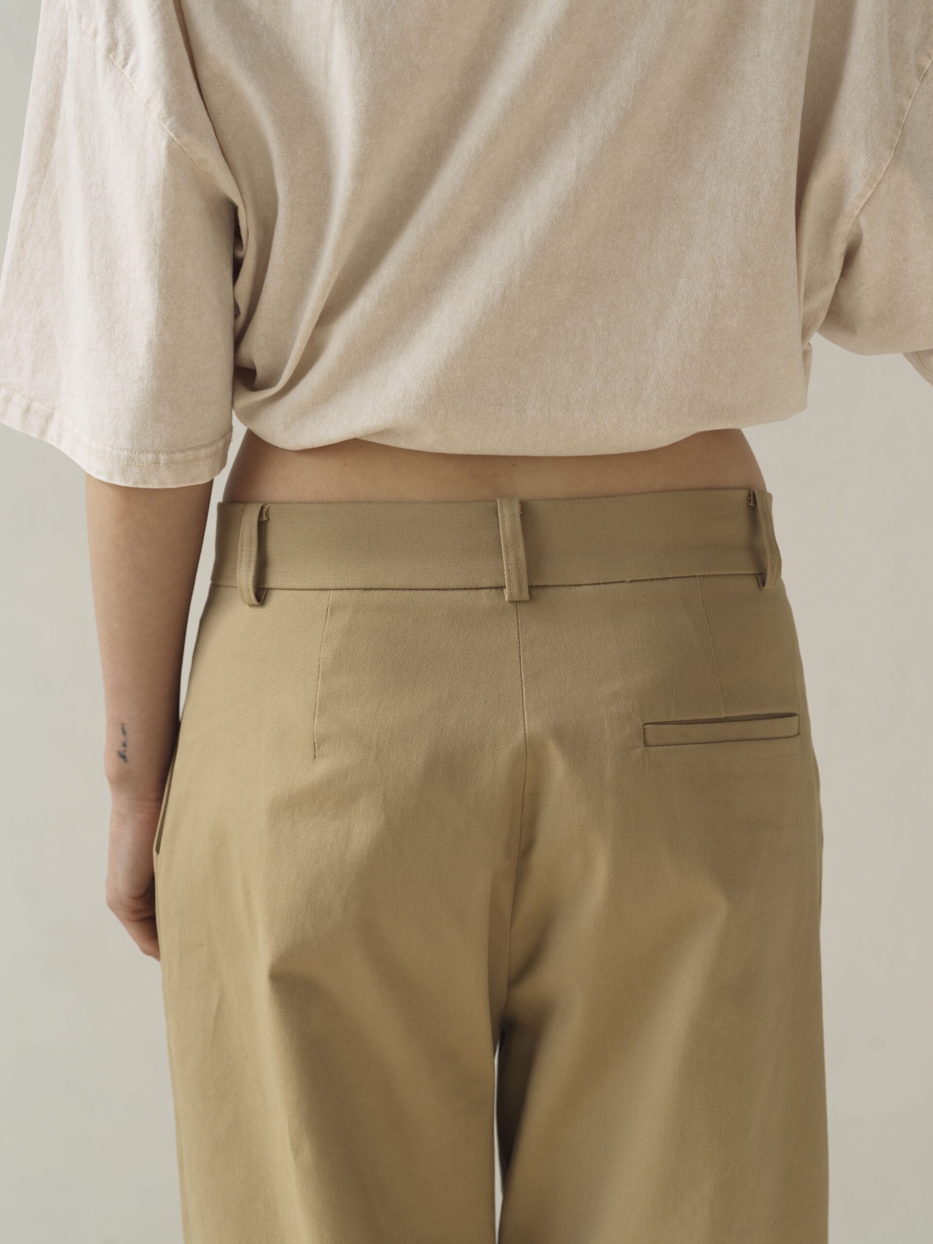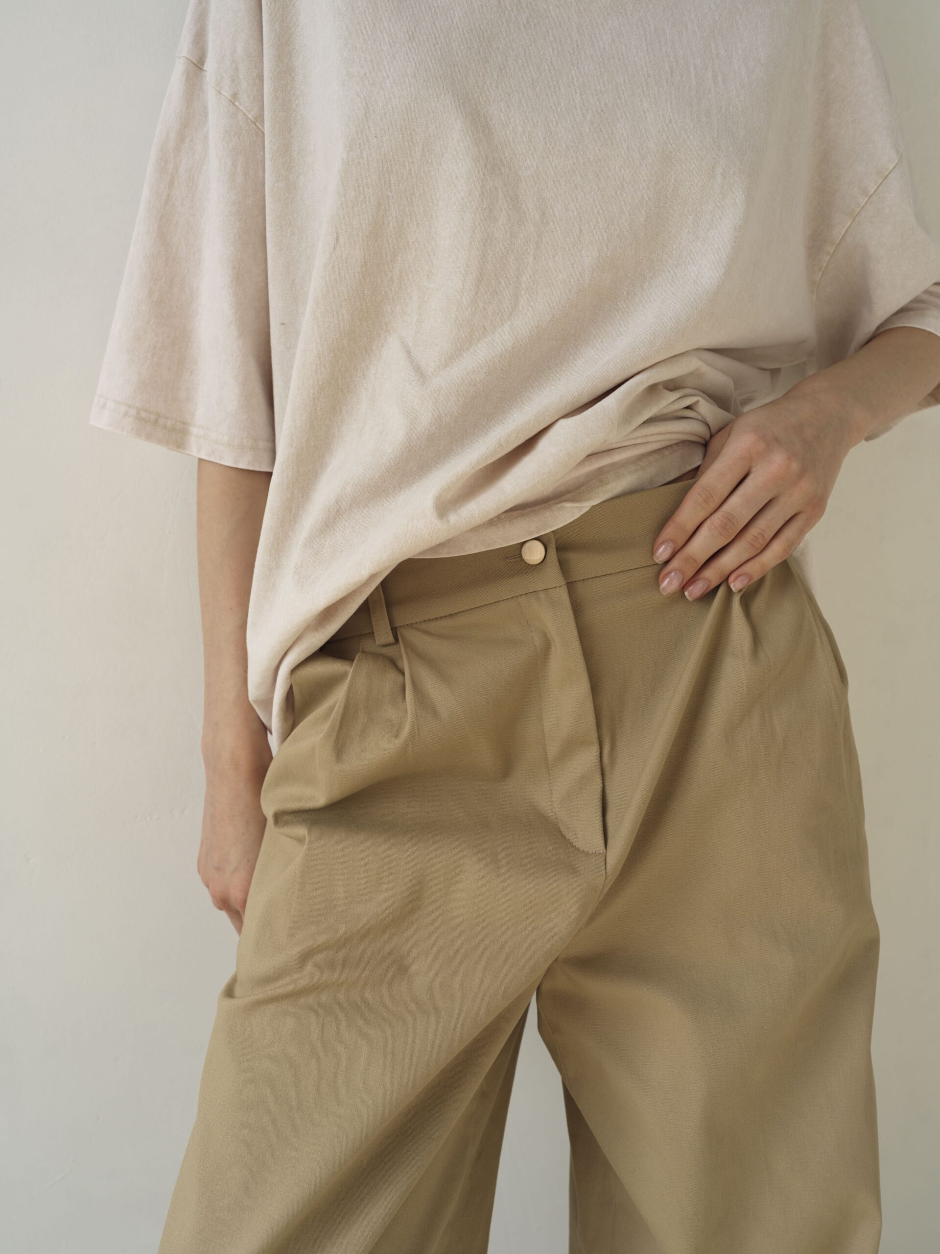 Модель має високу посадку,але завдяки розміру можна редагувати посадку, дві зручні кишені, застібку на блискавку та ґудзик. Легкі складки спереду додають об’єму та підкреслюють актуальний крій.