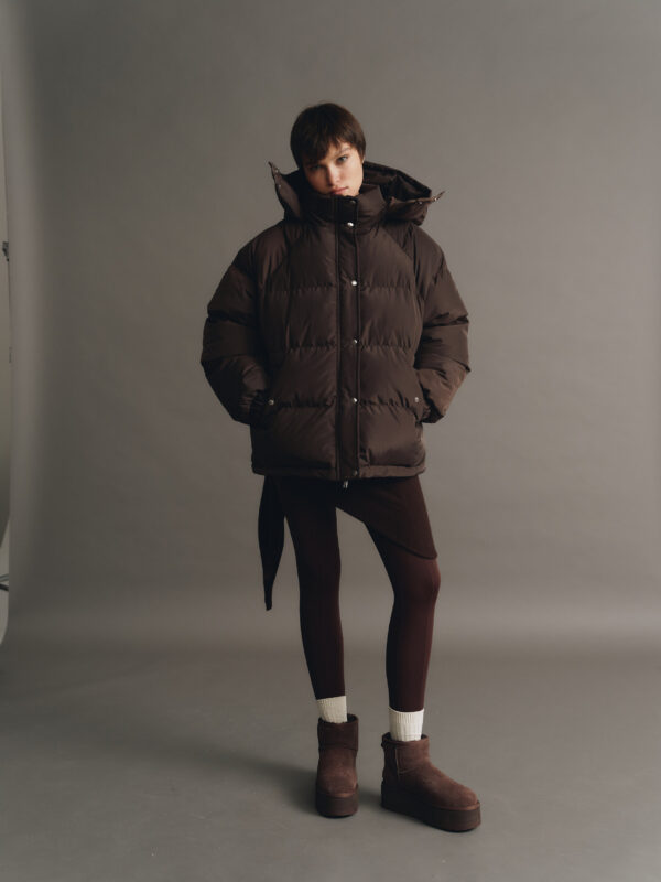 Базовий подовжений жилет із капюшоном. Вільна модель, бічні кишені, нижні фіксатори та пояс. На моделі розмір S/M у разі зростання 177см.