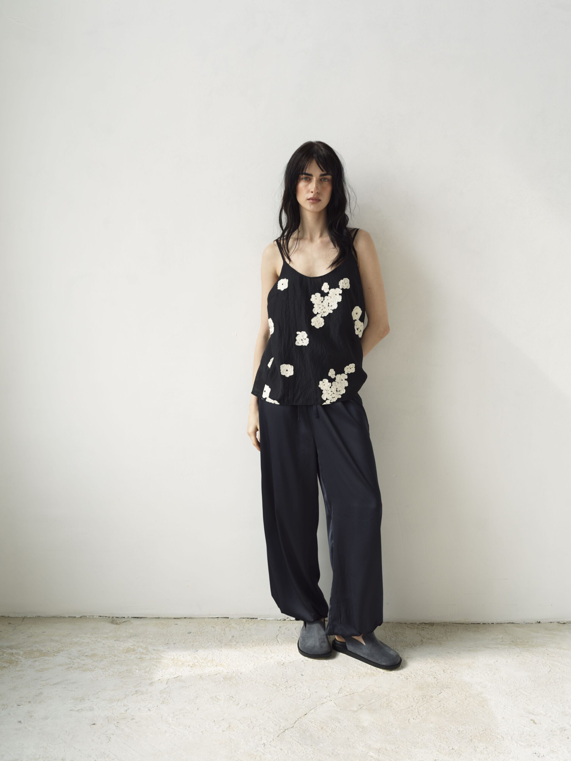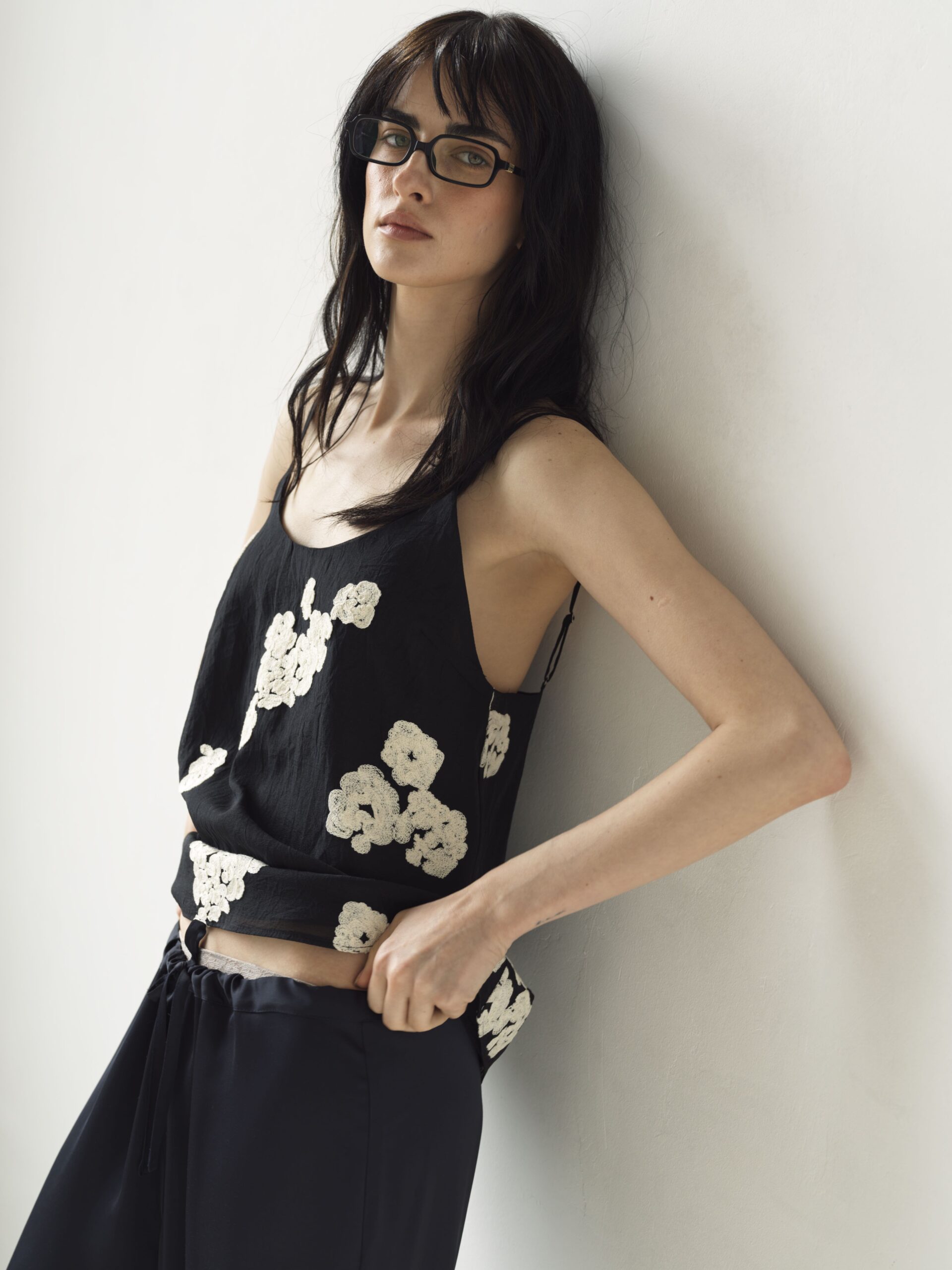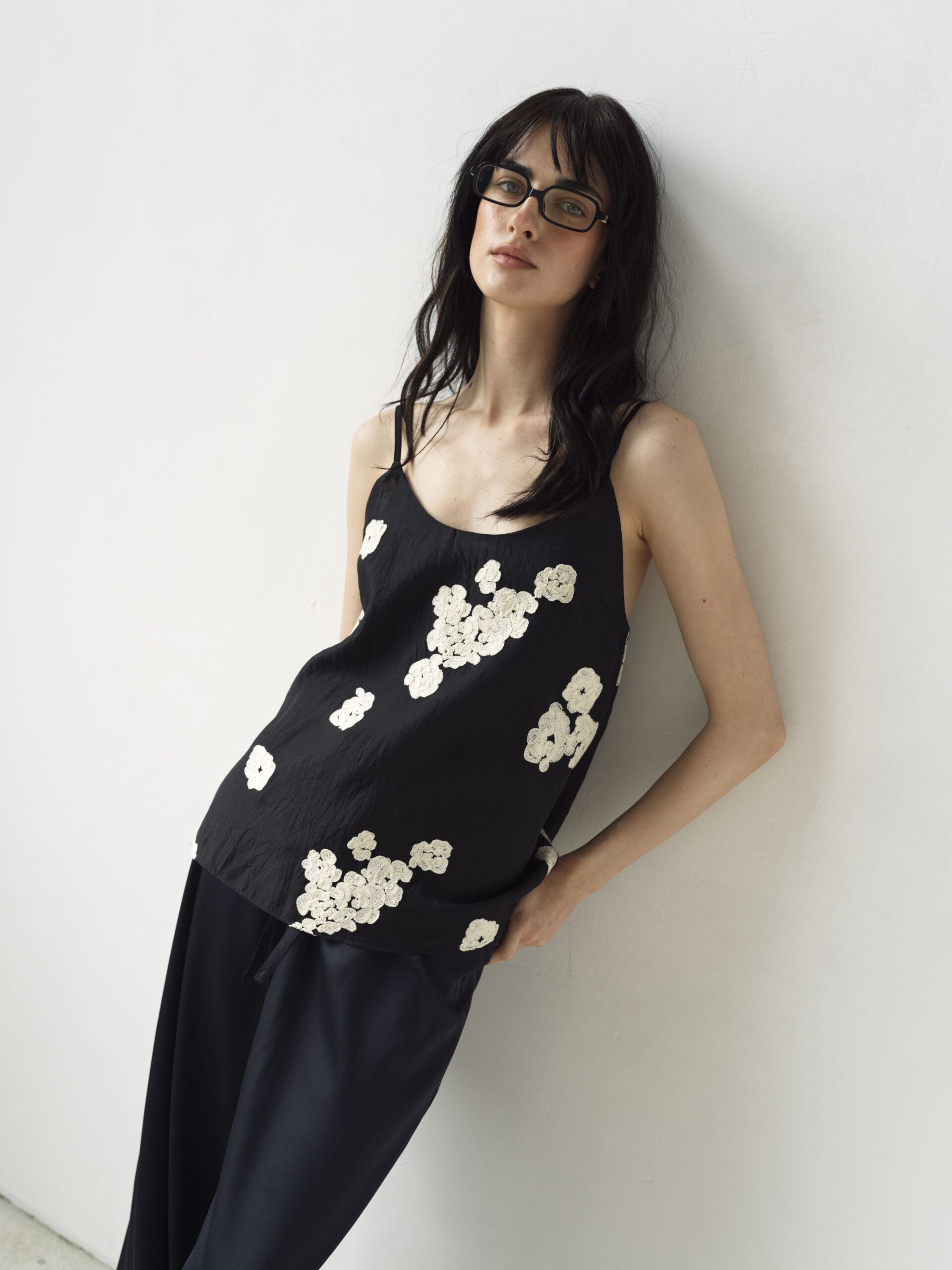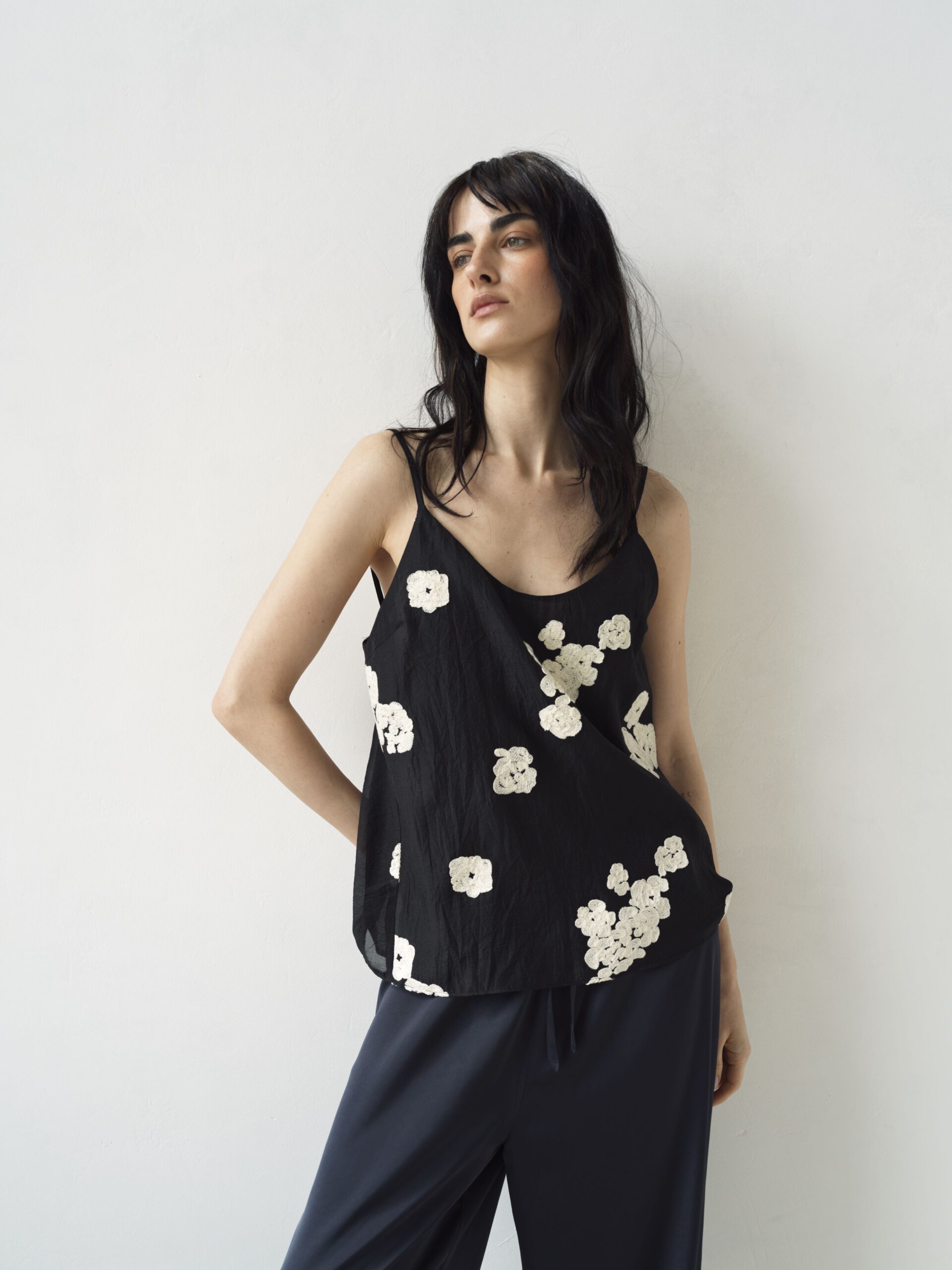 Делікатна ажурна вишивка додає витонченості та романтики, підкреслюючи лінію декольте. Тонкі бретелі регулюються, що забезпечує ідеальну посадку.