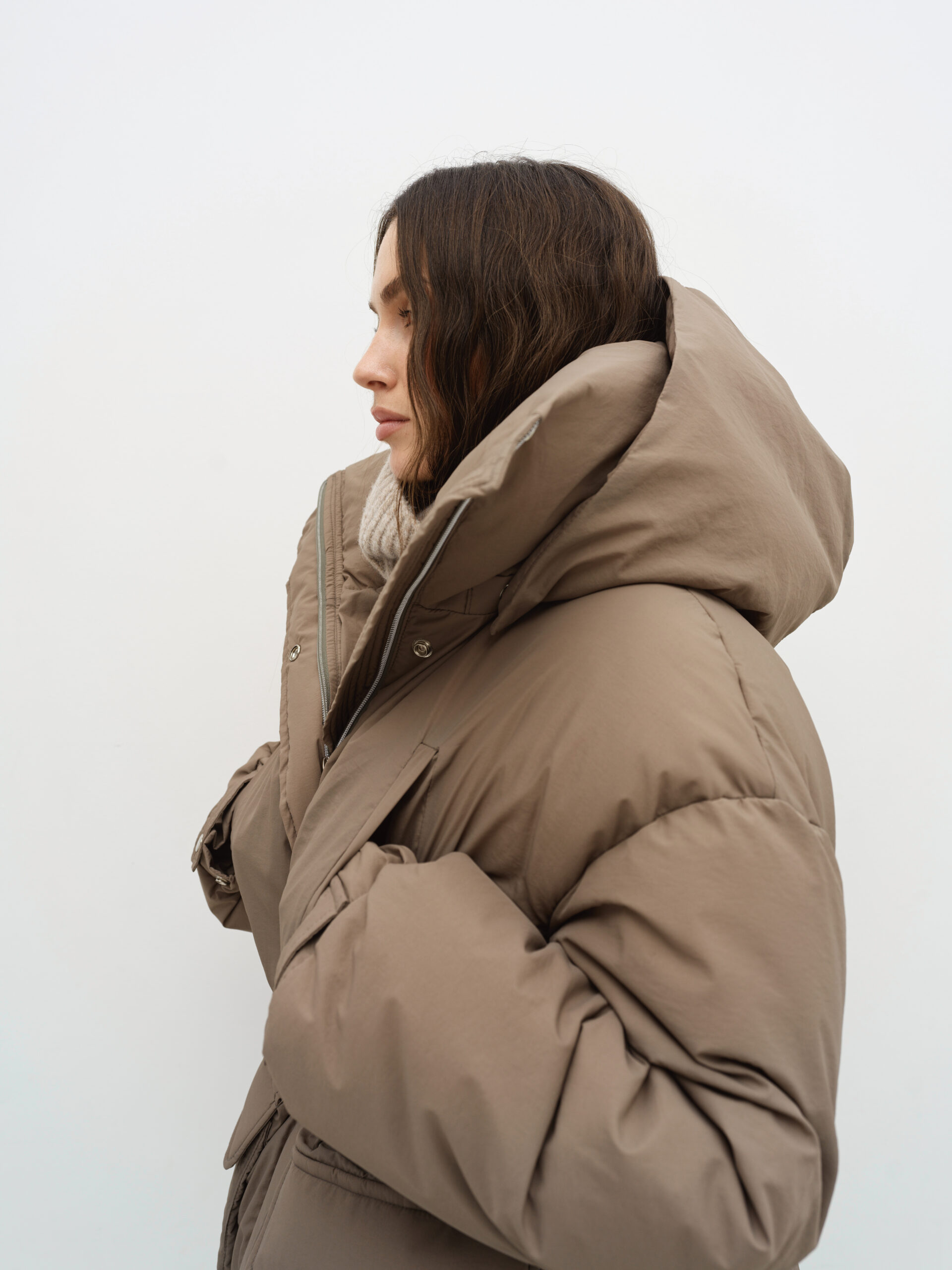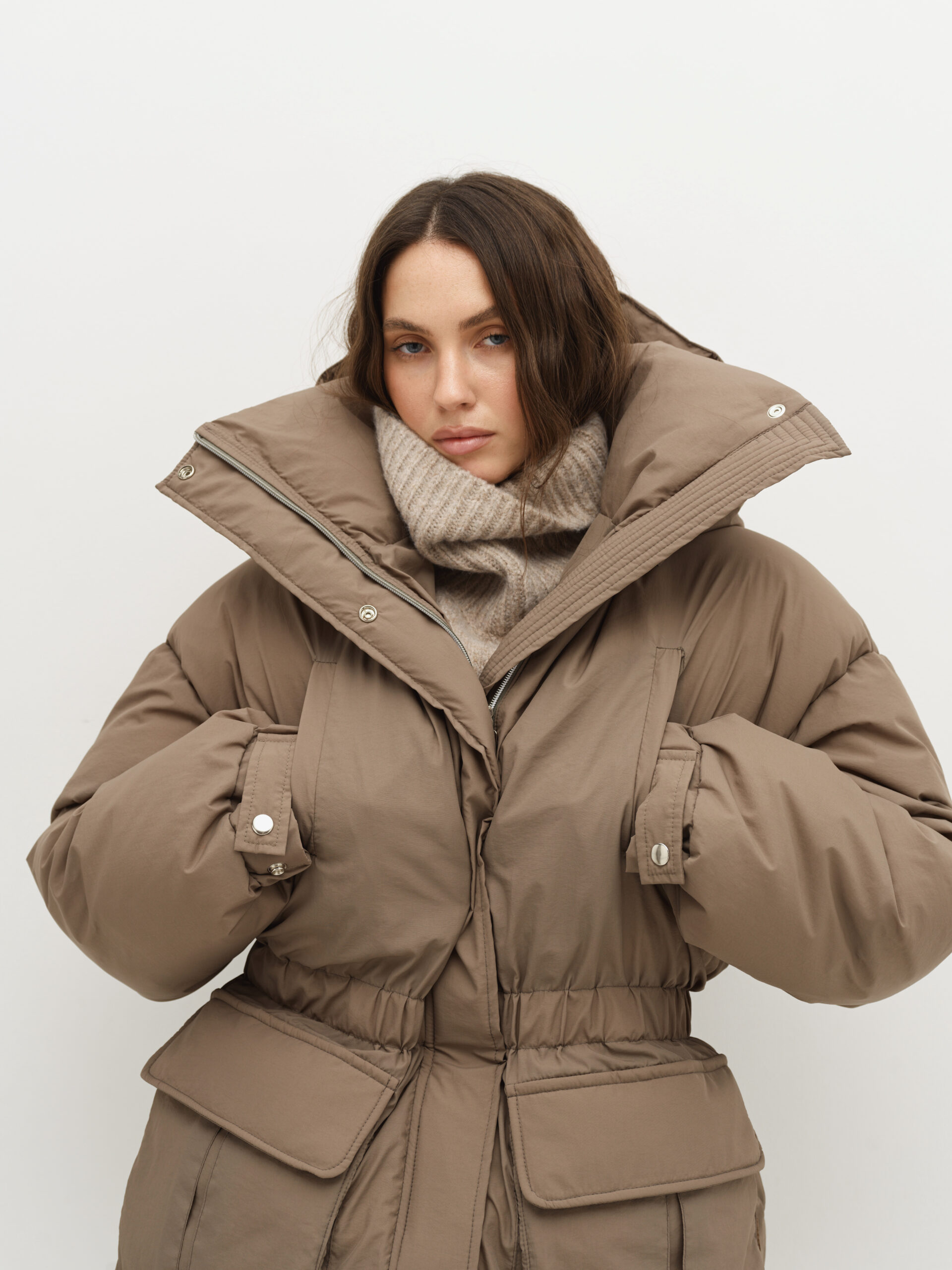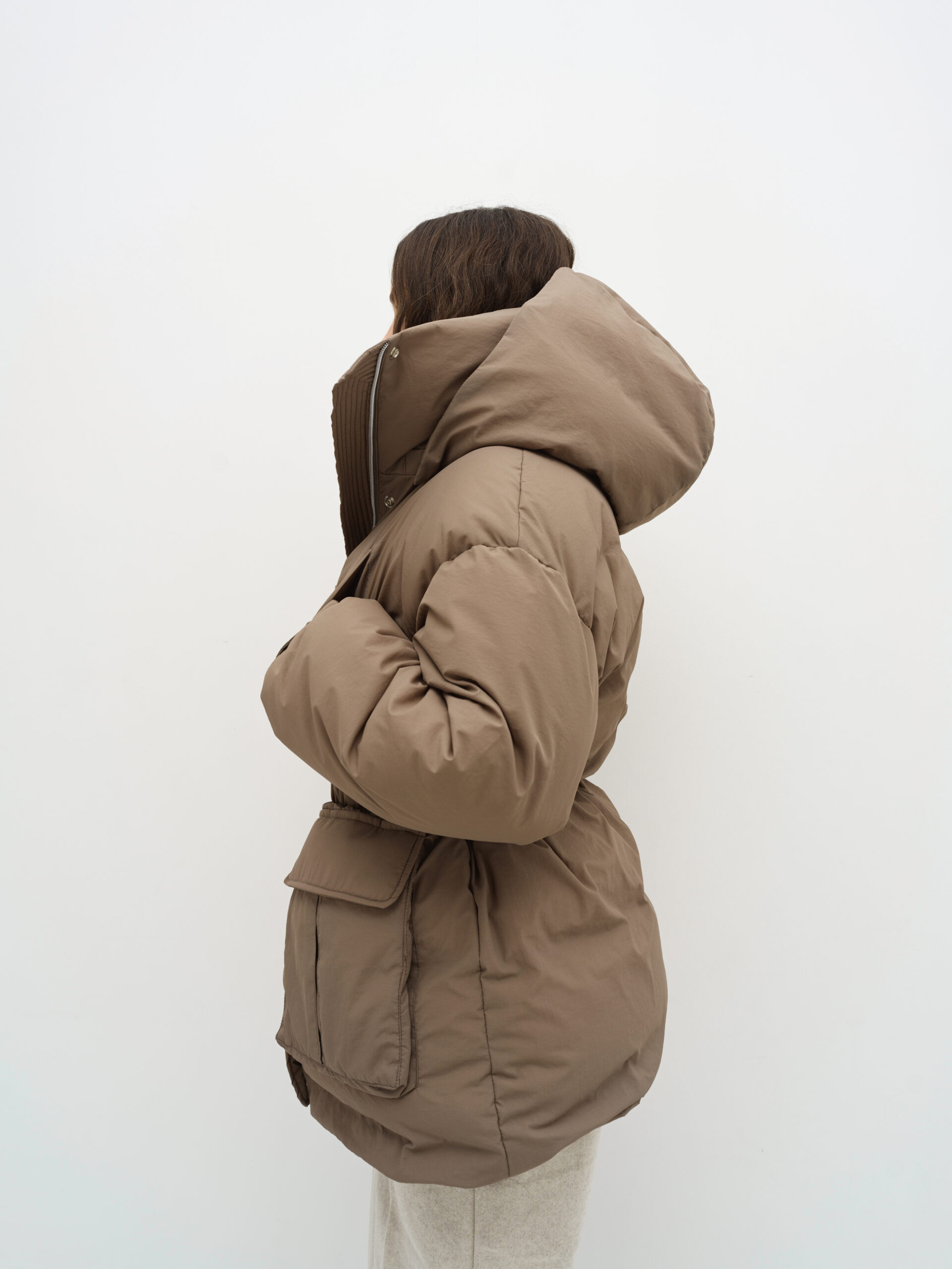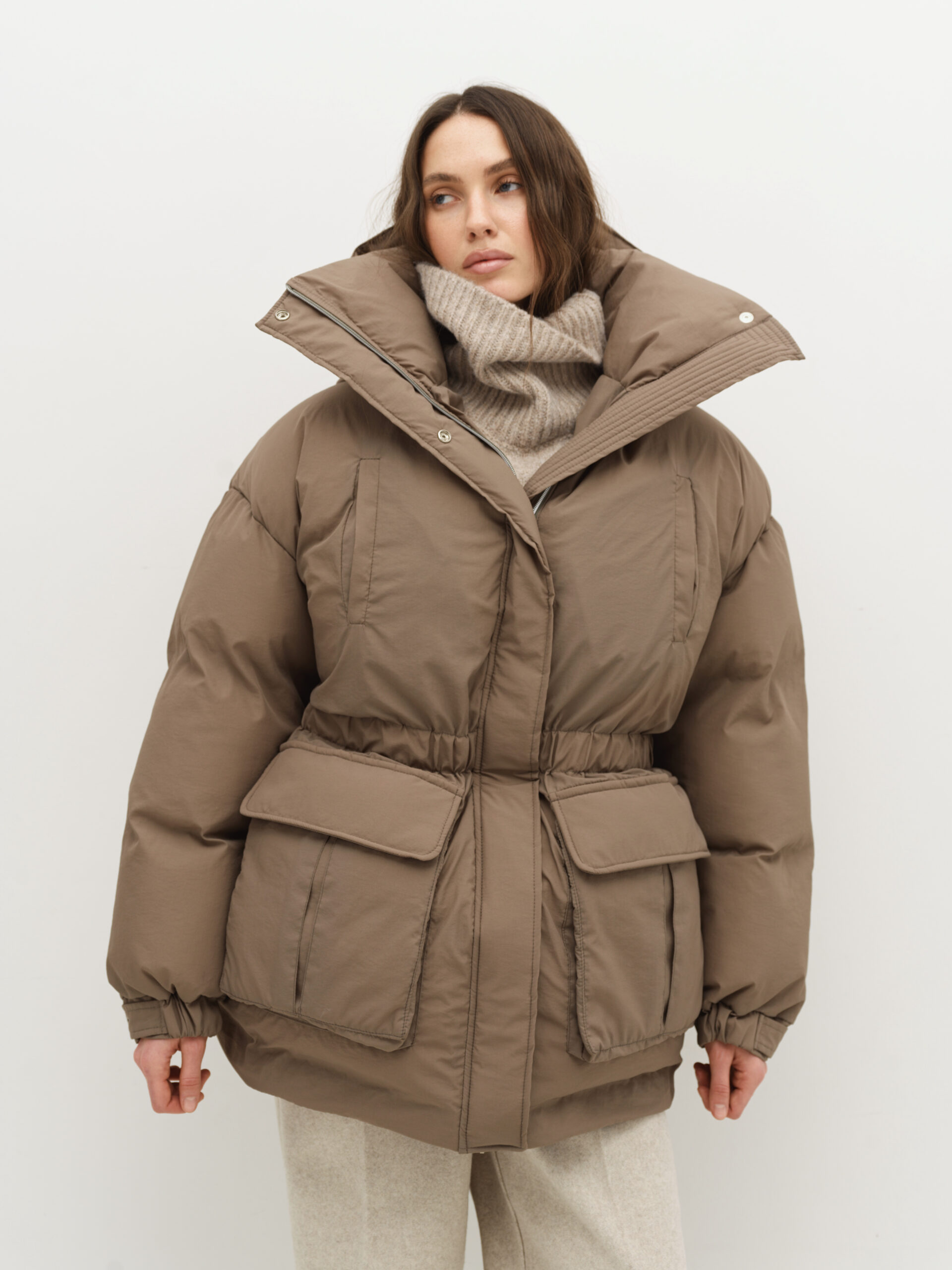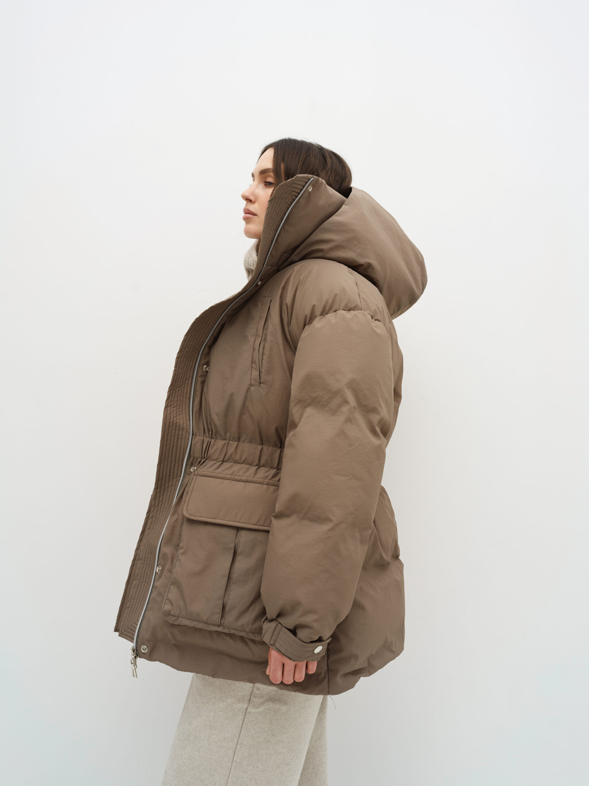Об’ємна парка з накладними кишенями та капюшоном, який відстібається, пуховик на блискавці та кнопках, має резинку та куліску на таліі. Температурний режим -20°C, наповнювач біопух, легкий і теплий, гіпоалергенний. На моделі розмір xs/s при зрості 177 см