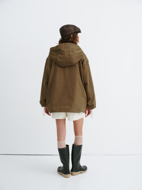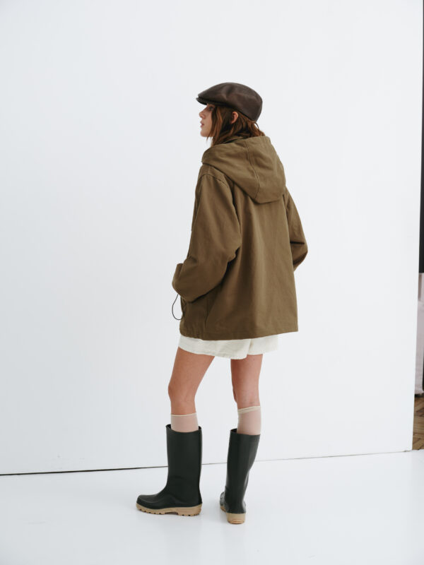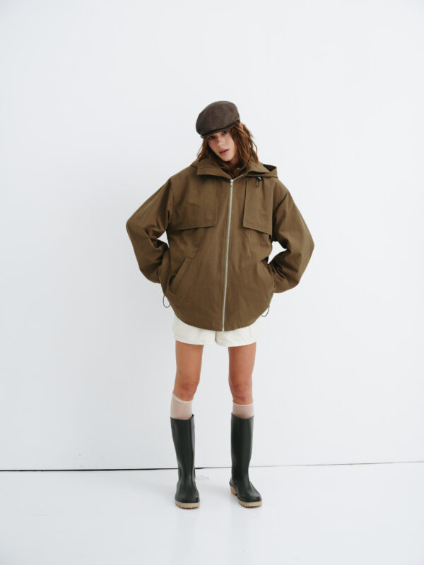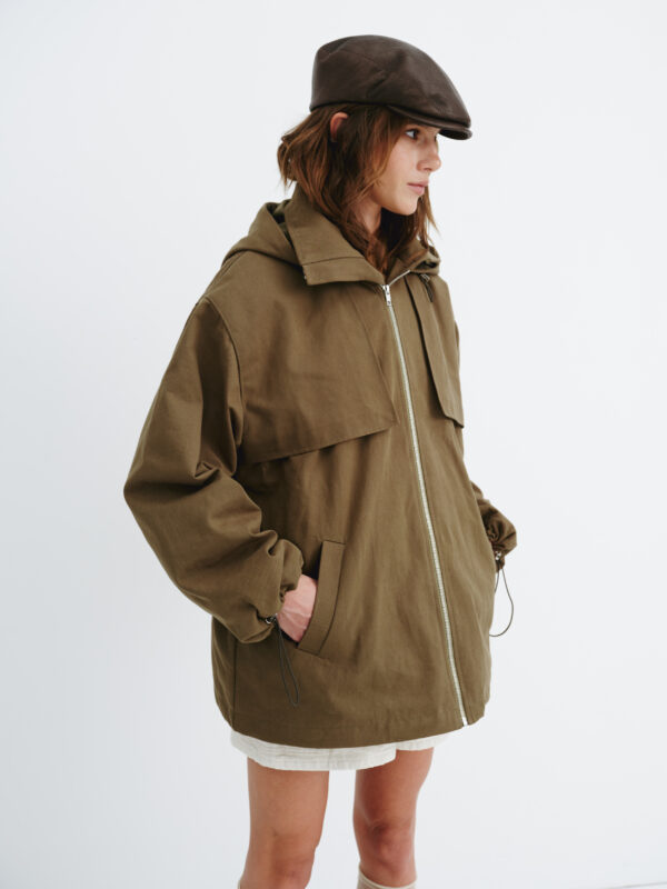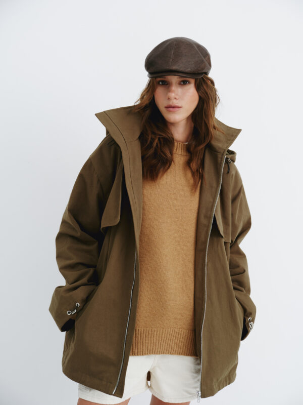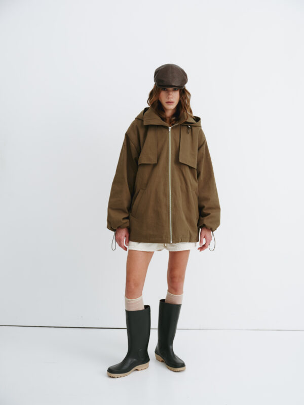 Об’ємна парка з фіксаторами та капюшоном, парка на блискавці, має резинку з фіксатора ми на рукавах та знизу, які регулюють довжину та обʼєм. Температурний режим до +8°C. На моделі розмір xs/s при зрості 172 см
