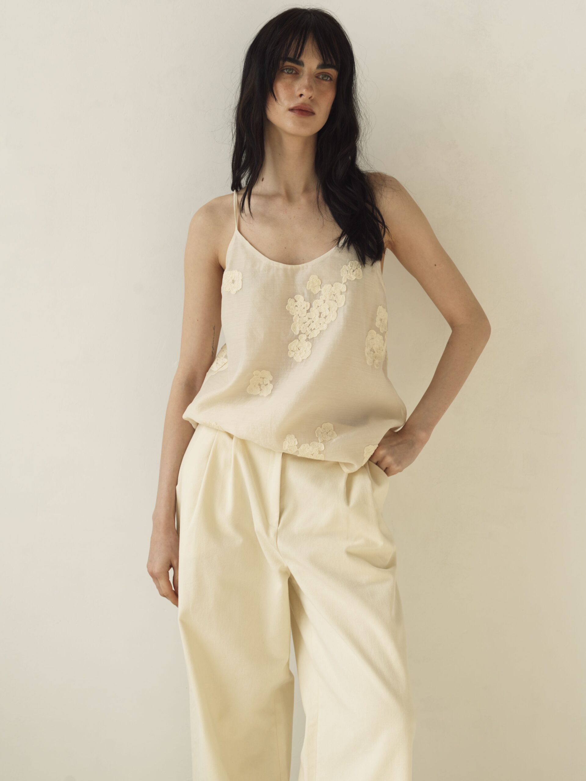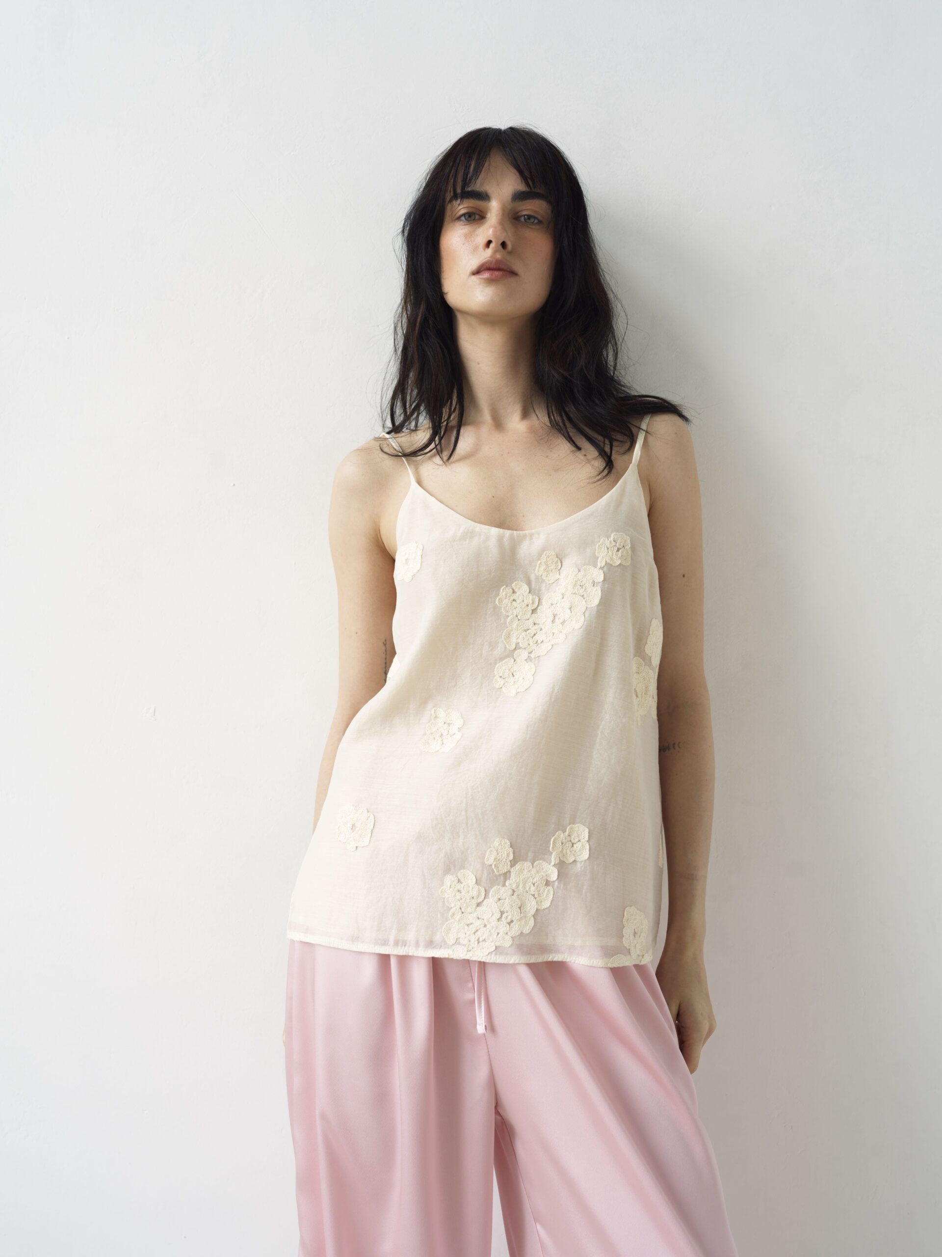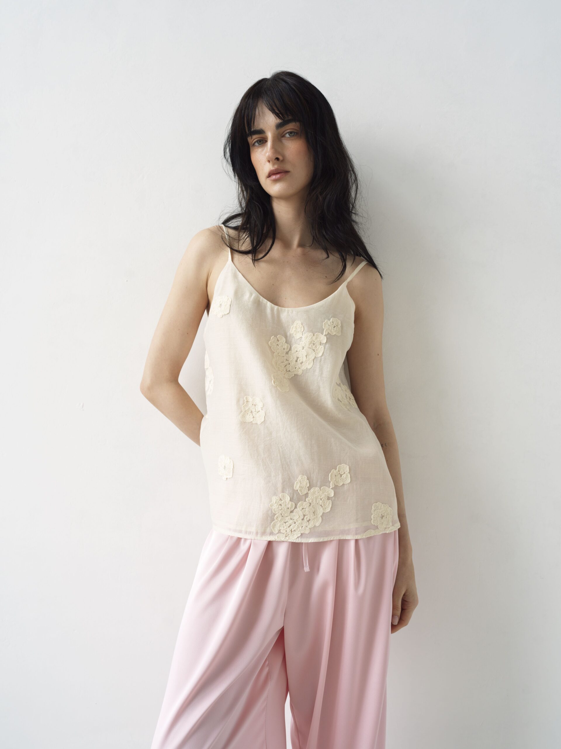 Делікатна ажурна вишивка додає витонченості та романтики, підкреслюючи лінію декольте. Тонкі бретелі регулюються, що забезпечує ідеальну посадку.