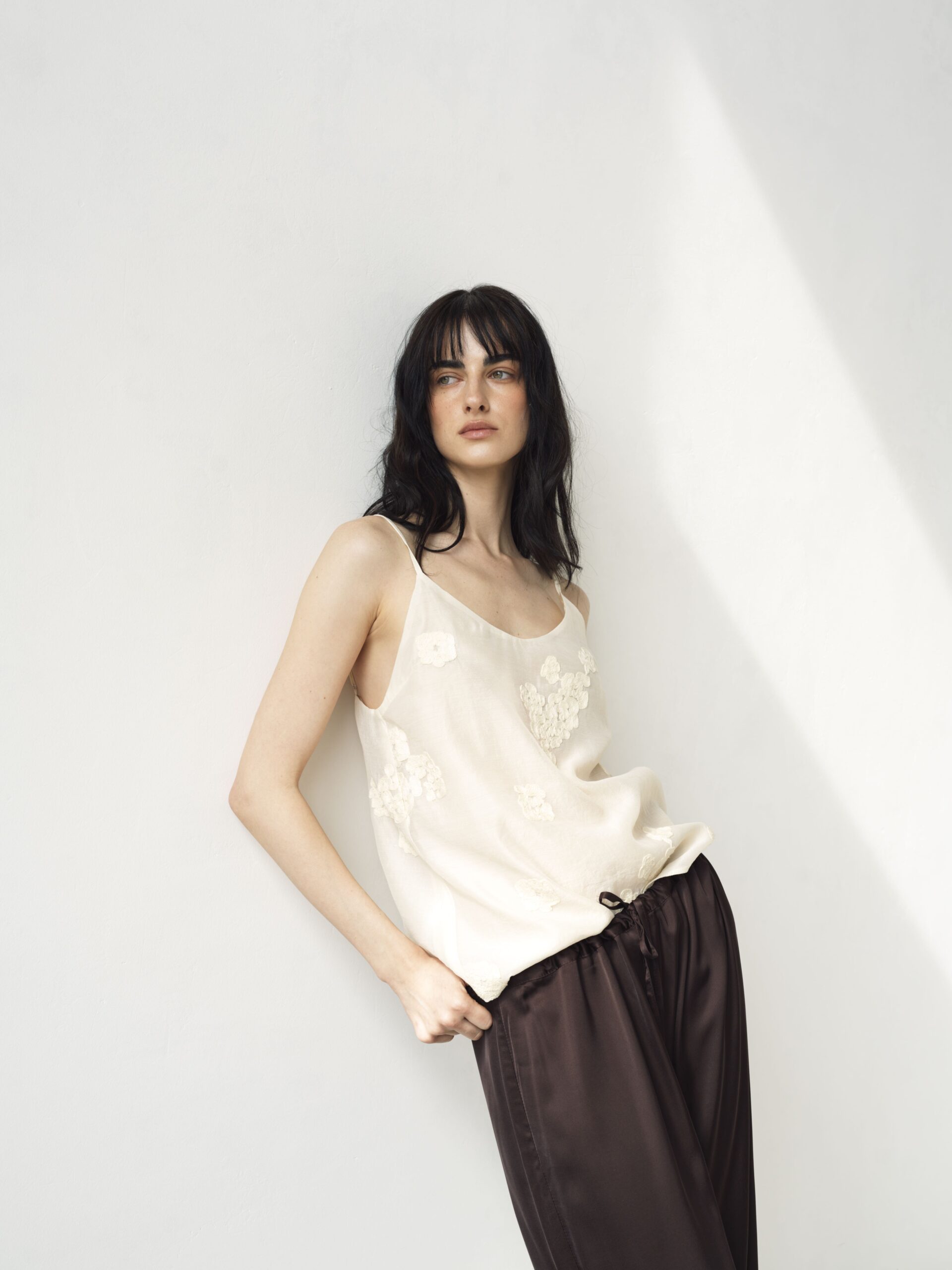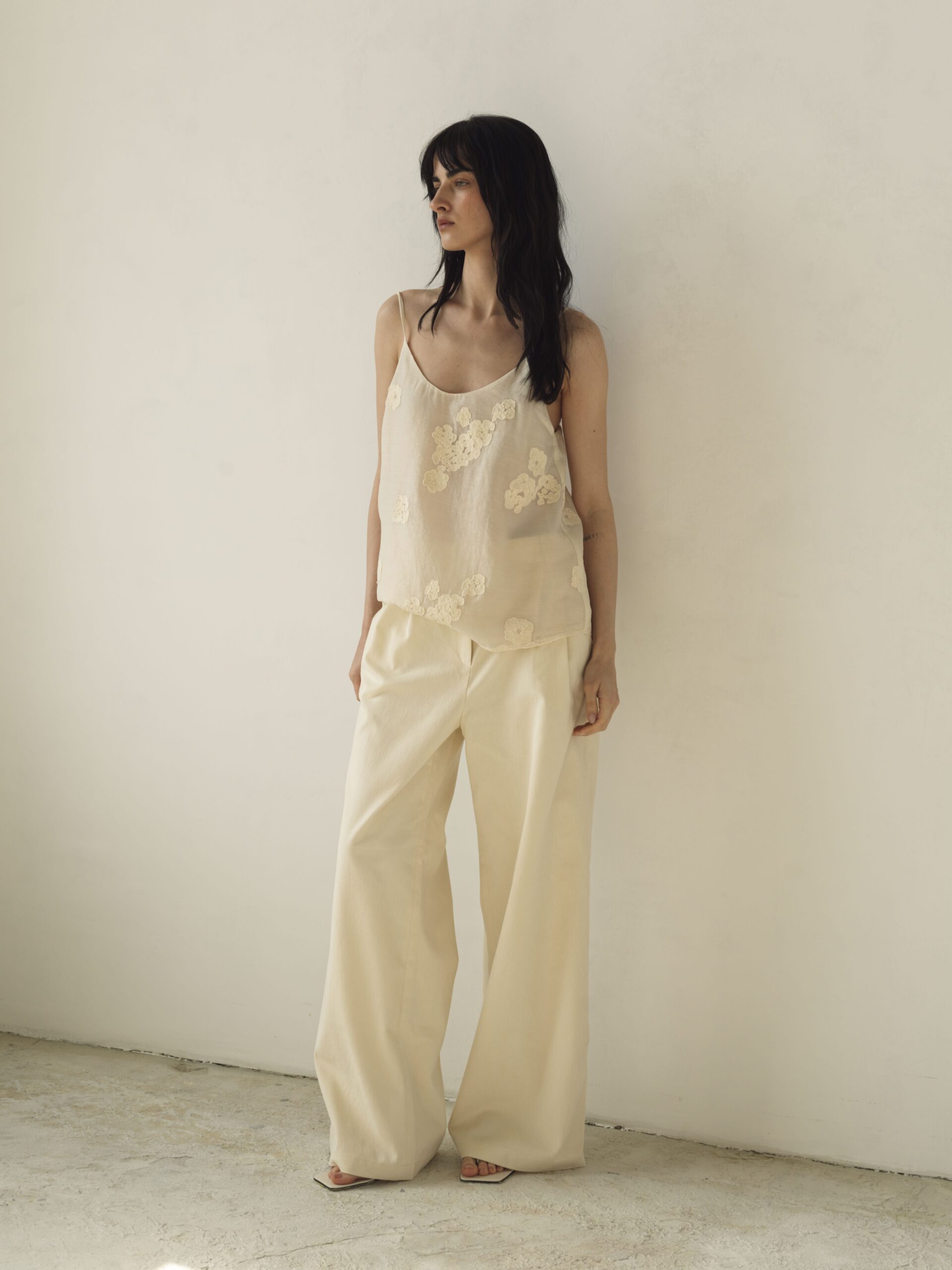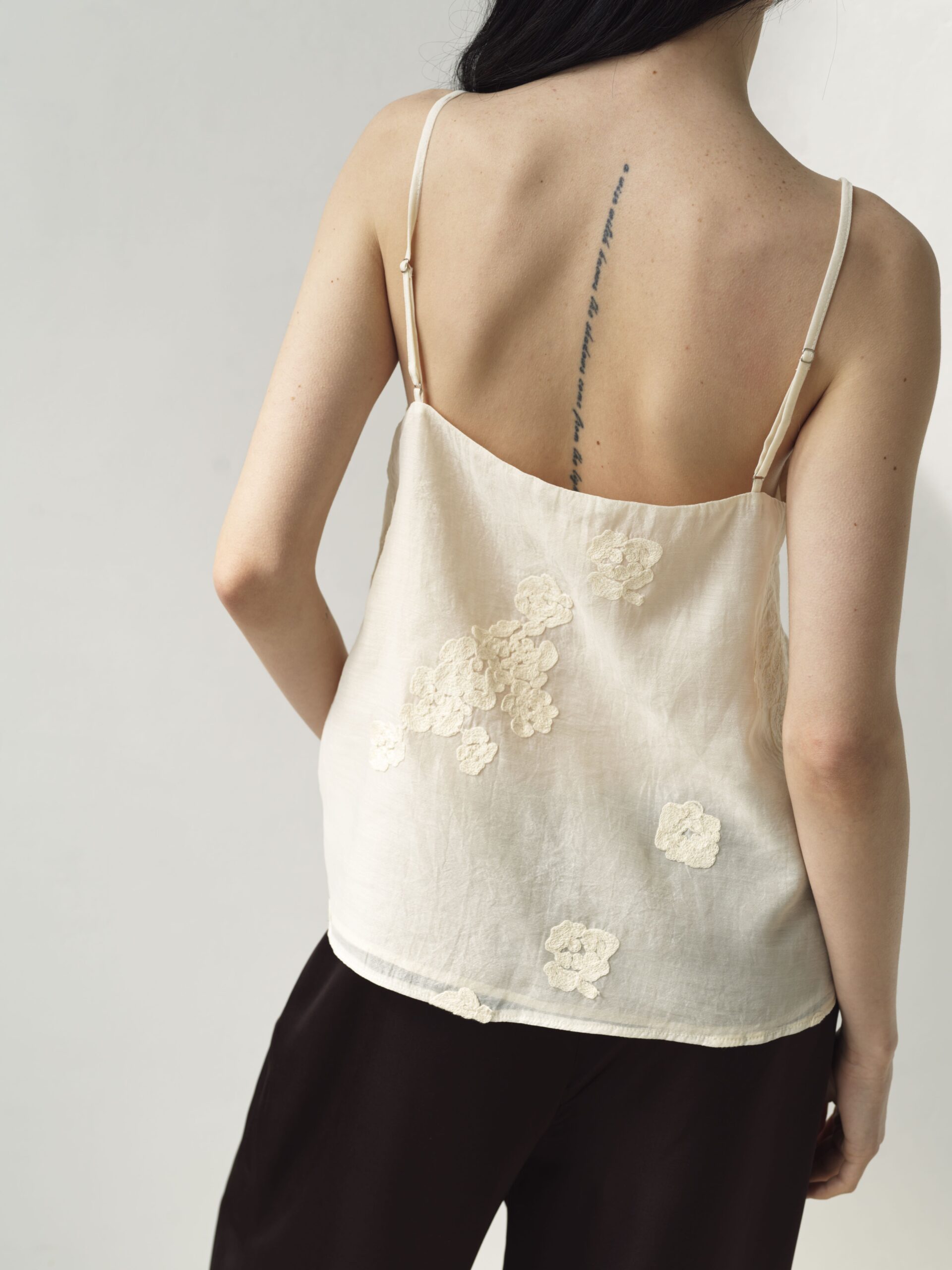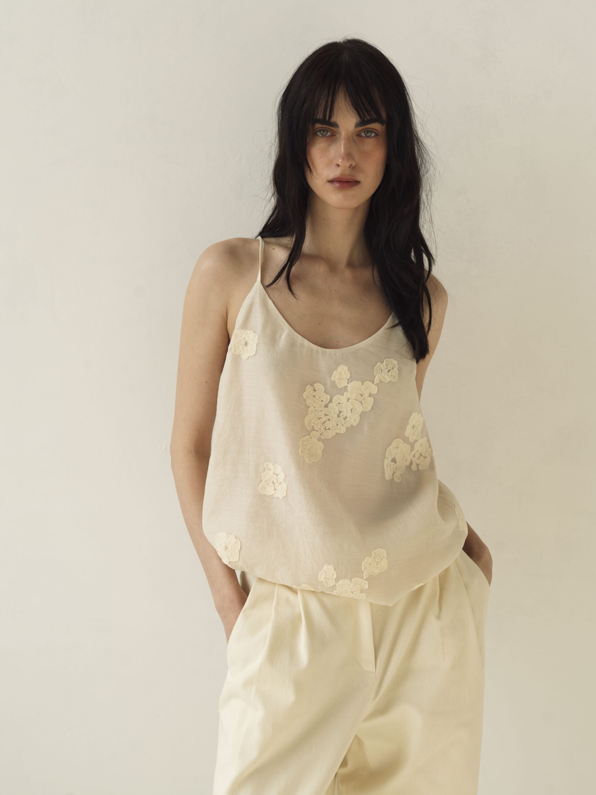 Делікатна ажурна вишивка додає витонченості та романтики, підкреслюючи лінію декольте. Тонкі бретелі регулюються, що забезпечує ідеальну посадку.