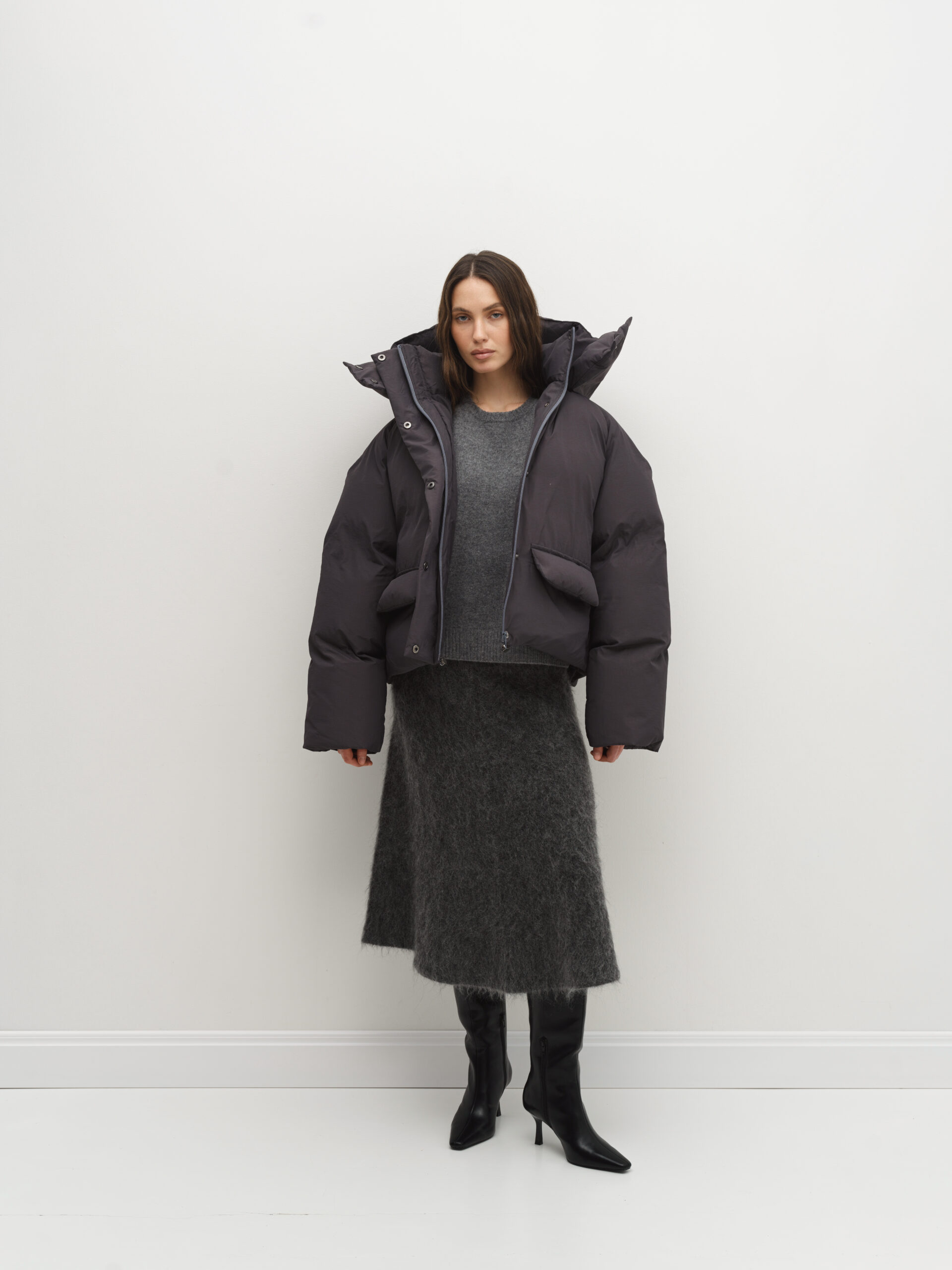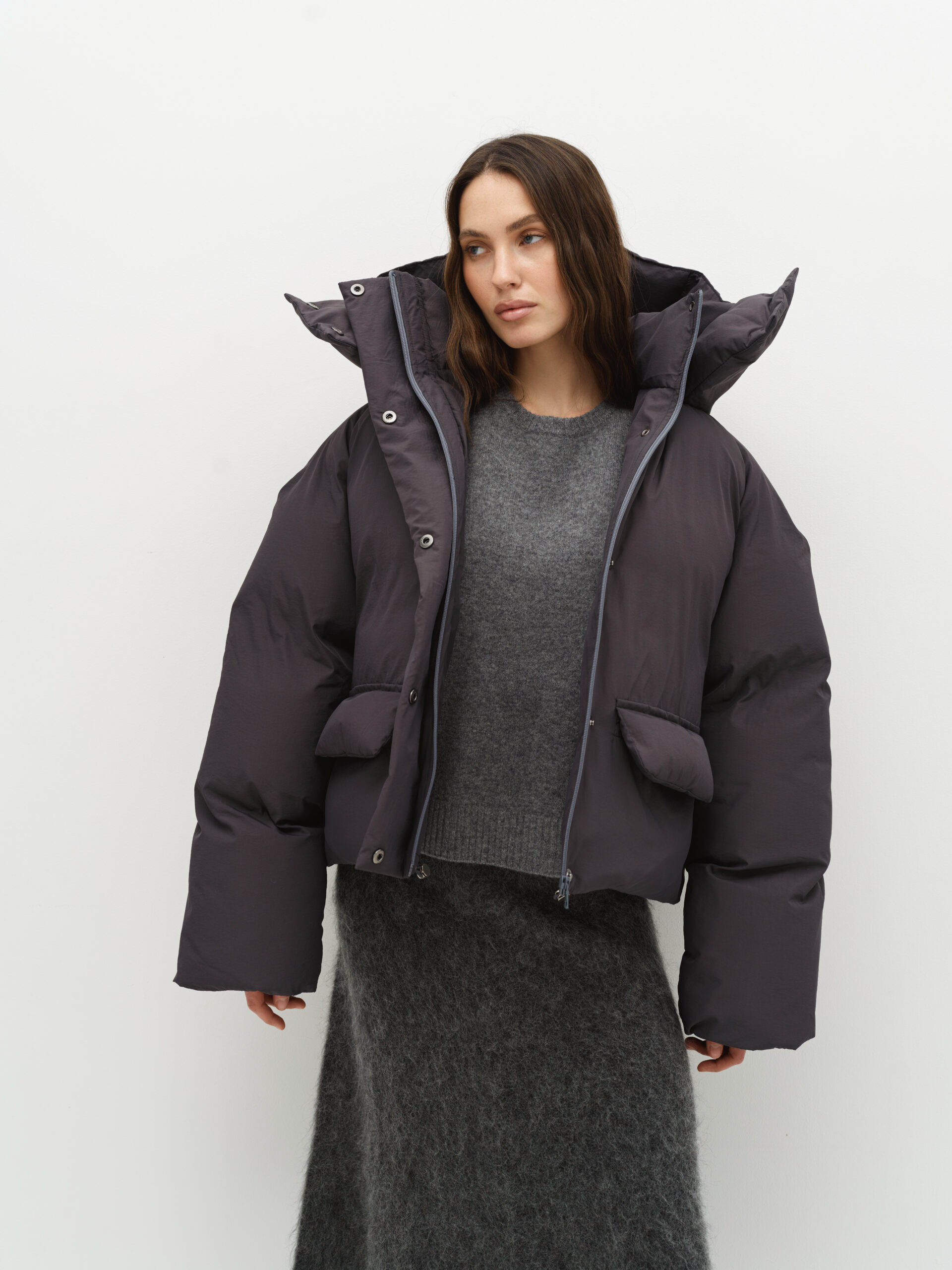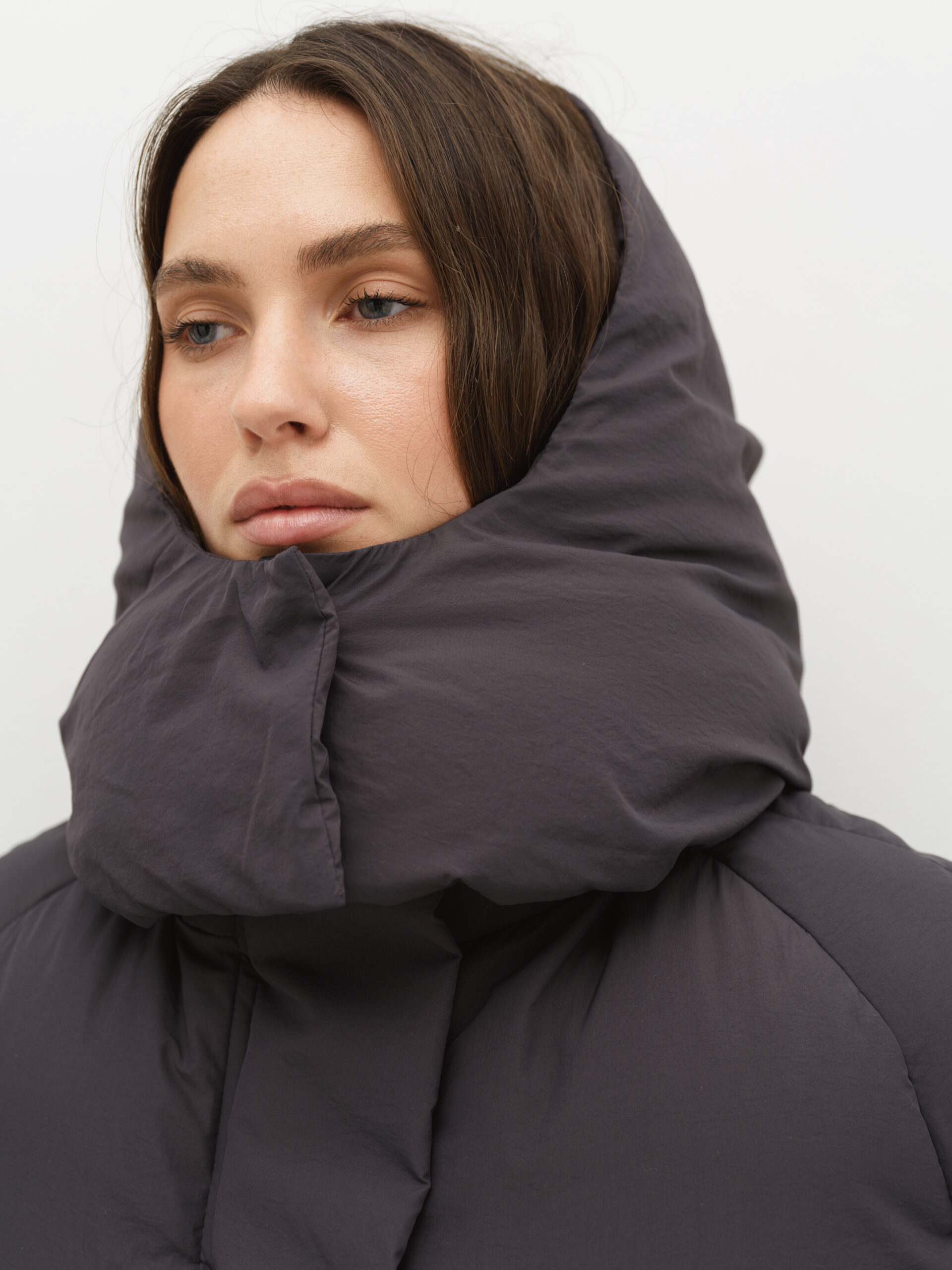 Об’ємний пуховик з капюшоном, який відстібається, пуховик на блискавці та кнопках, має дві бічні кишені. Температурний режим -20°C, наповнювач біопух, легкий і теплий, гіпоалергенний. На моделі розмір m/l при зрості 176,6 cm