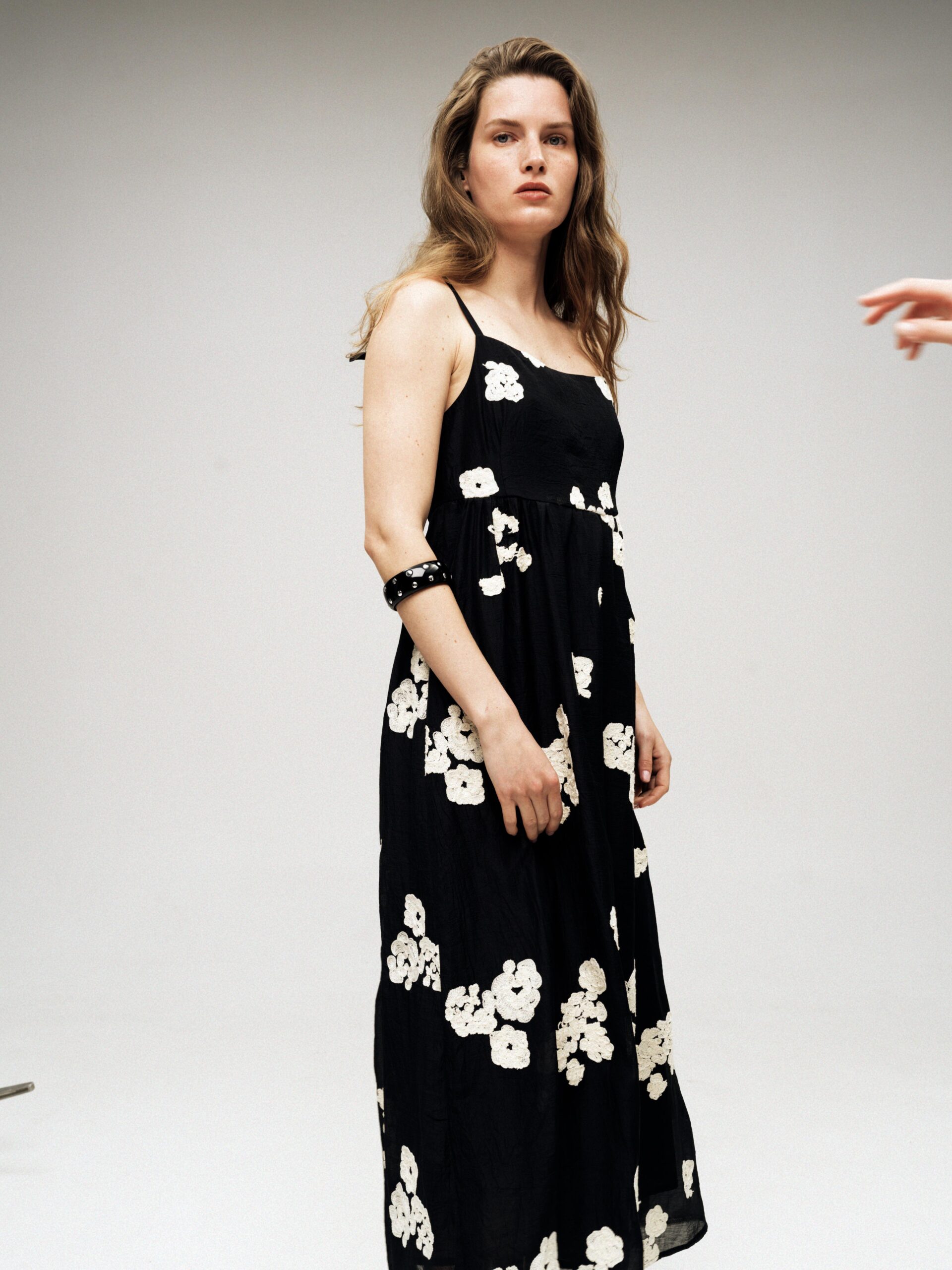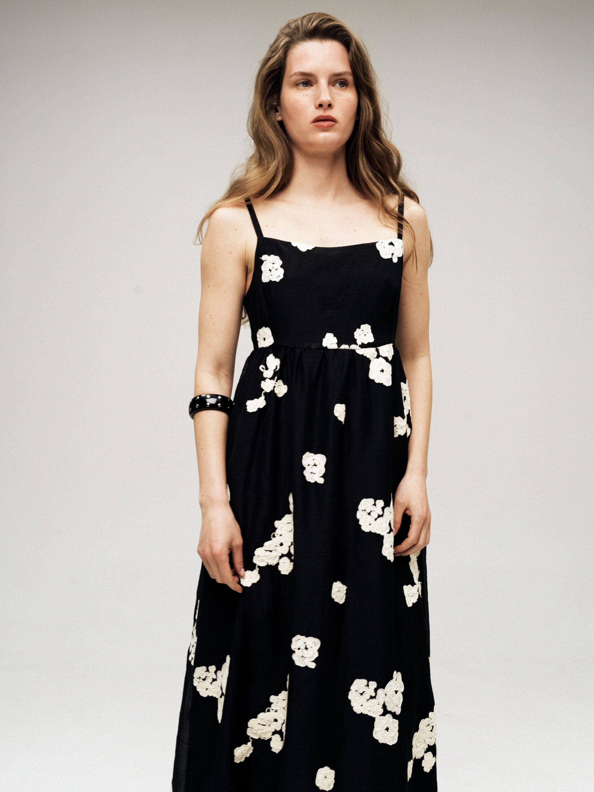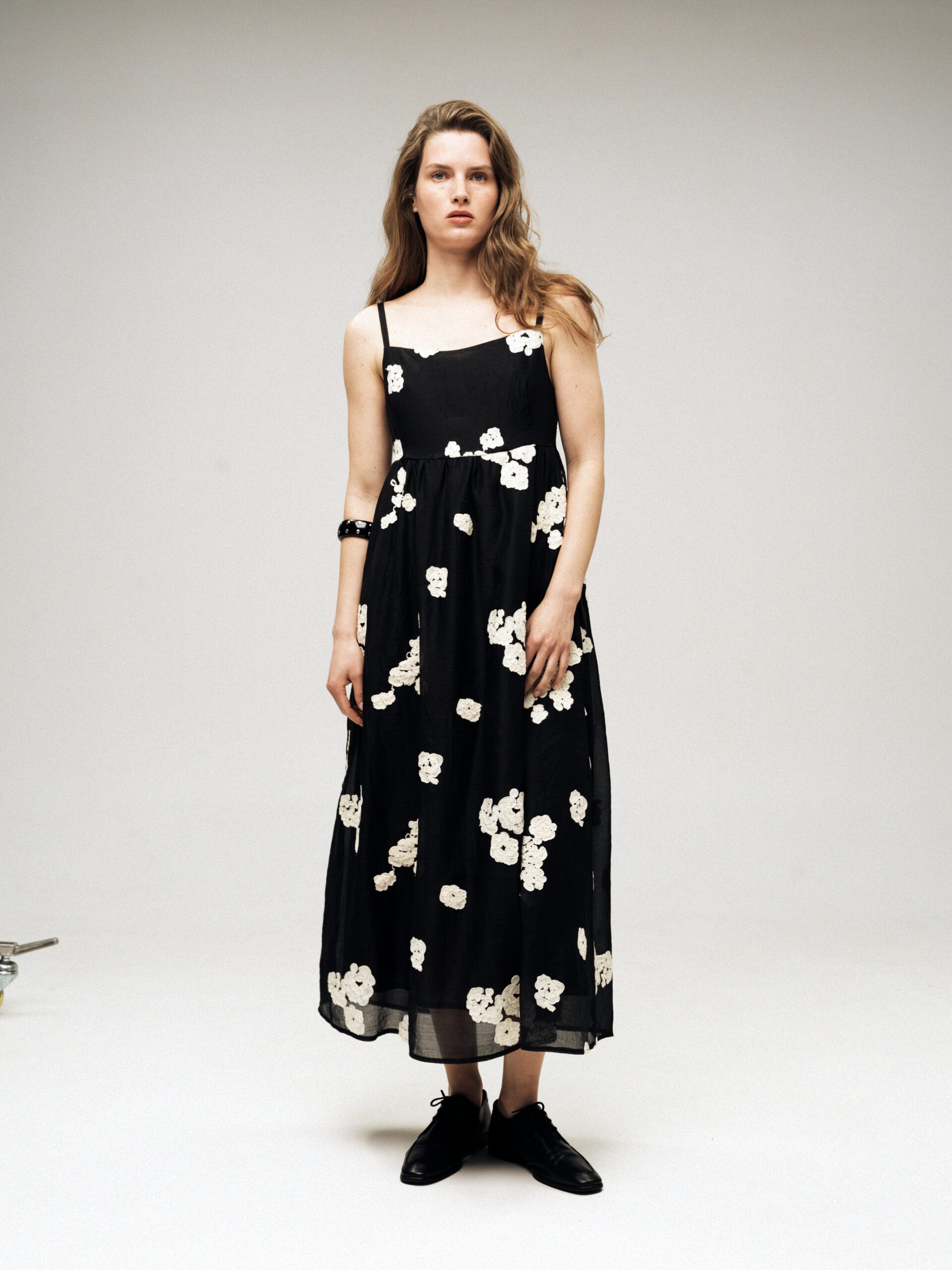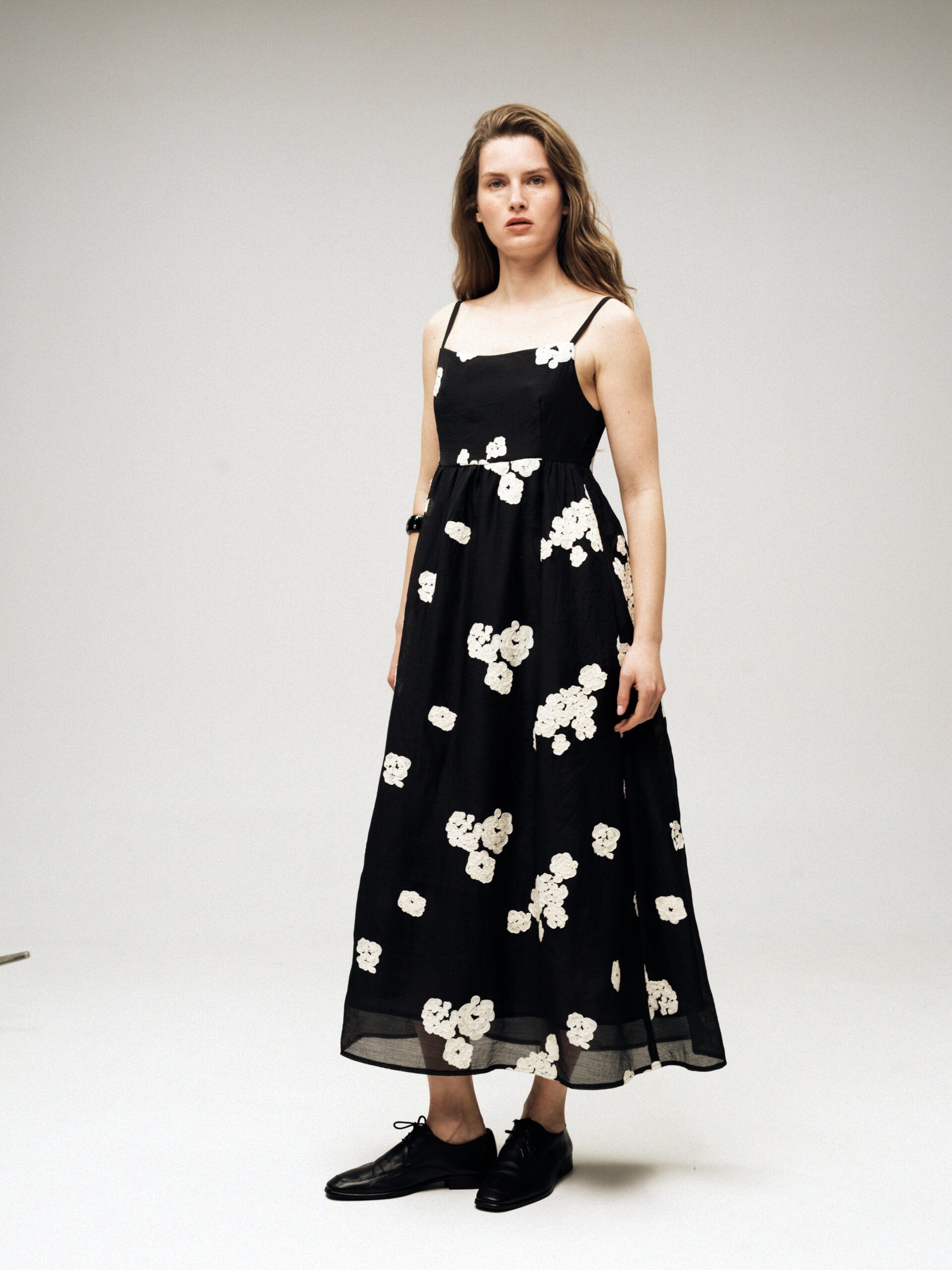 Сукня з ажурного мережева на підкладі. Застібка на потаємну блискавку в боковому шві, тонкі брітелі регулюють посадку по фігурі. На моделі розмір S/M при зрості 177 см